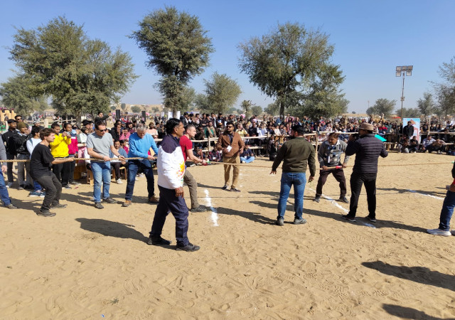 रायसर के धोरों पर आयोजित “दम-खम ग्रामीण खेल प्रतियोगिताओं” में रस्साकशी, कुश्ती, कबड्डी और खो-खो जैसी पारंपरिक प्रतियोगिताएं हुईं। ग्रामीण खिलाड़ियों के साथ-साथ विदेशी पर्यटकों ने भी इन खेलों में उत्साहपूर्वक भाग लिया, जिससे माहौल और अधिक जीवंत हो गया। महिलाओं की मटका दौड़ और भारतीय-विदेशी पर्यटकों के बीच रेस ने दर्शकों का भरपूर मनोरंजन किया।