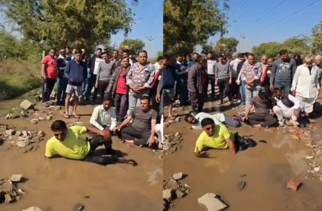 लोगों ने कीचड़ में बैठकर जताया आक्रोश