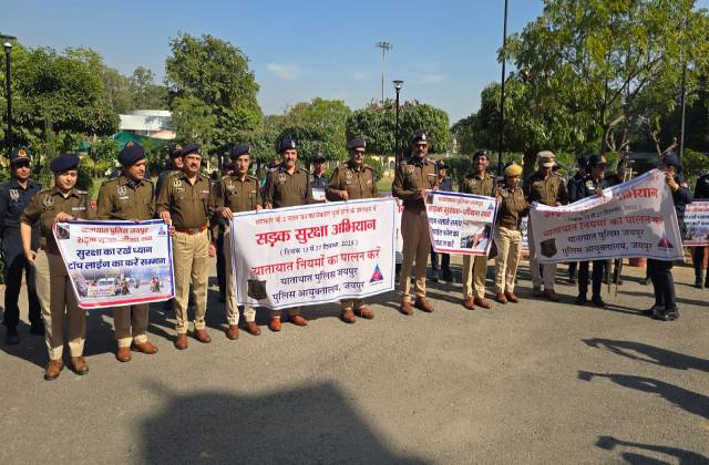 जयपुर, 13 दिसम्बर। जयपुर पुलिस आयुक्त सचिन मित्तल ने सरकार के 2 वर्ष का कार्यकाल पूर्ण होने के उपलक्ष्य मे आयुक्तालय जयपुर मे 13 से 27 दिसम्बर तक दो सप्ताह का सड़क सुरक्षा अभियान के तहत यातायात पुलिस और कालिका पेट्रोलिंग यूनिट द्वारा आमजन को यातायात नियमों के प्रति जागरूकता का संदेश देने शहर के प्रमुख मार्गो पर जन जागरूकता के लिए वाहन जागरूकता रैली को पुलिस आयुक्तालय परिसर से हरी झंडी दिखा कर रवाना किया।