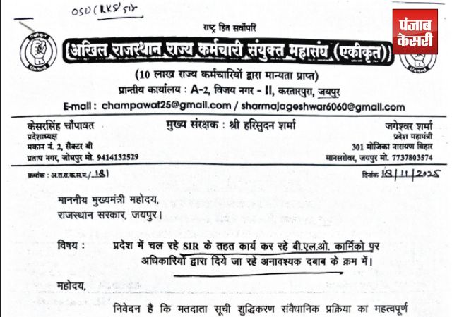 अखिल राजस्थान राज्य कर्मचारी संयुक्त महासंघ एकीकृत के प्रदेश महामंत्री जगेश्वर प्रसाद शर्मा ने मुख्यमंत्री को ज्ञापन सौंप प्रदेश भर में चल रहे विशेष सघन मतदाता सूची पुनरीक्षण कार्यक्रम SIR में अधिकारियों द्वारा सुपरवाइजर/बीएलओ कार्य में लगे शिक्षकों/कार्मिकों के साथ अमानवीय व्यवहार के लिए गहरा रोष व्यक्त किया है। अधिकारियों द्वारा अनावश्यक दबाव के चलते कार्य लगे कार्मिक अवसाद व मानसिक दबाव में है, उन्हें अनुशासनात्मक कार्यवाही, निलंबिन व बर्खास्तिगी का भय दिखाकर रात दिन कार्य करने को मजबूर किया जा रहा है, कार्मिक 14 से 18 घंटे फील्ड में कार्य कर रहे हैं।इस दबाव के चलते अजमेर में दो शिक्षिकाऐं बेहोश हो गई तथा जयपुर में एक शिक्षक मुकेश कुमार जांगिड़ ने आत्महत्या कर अपनी जान दे दी। जगेश्वर प्रसाद शर्मा ने बताया कि मुख्यमंत्री महोदय को 11 बिन्दुओं का ज्ञापन सौंप स्थिति से अवगत कराते हुए इस व्यवस्था में हस्तक्षेप व व्यवस्था के शिकार शिक्षक को आर्थिक मुआवजा व आश्रित परिवार जन में से एक सदस्य को सरकारी नौकरी की मांग रखी। महासंघ के प्रदेश संयुक्त मंत्री हरिश्चन्द्र प्रजापति राज्य निर्वाचन आयोग से अपील की है SIR महत्त्वपूर्ण कार्यक्रम है यह समयबद्ध तभी पूरा होगा जब कार्मिकों/शिक्षकों के साथ सौहार्दपूर्ण व्यवहार रखते हुए कार्य को अंजाम दिया जायेगा। शिक्षकों पर दोहरी जिम्मेदारी है SIR कार्य के साथ साथ विद्यार्थियों का शिक्षण व अर्द्धवार्षिक परीक्षाओं को भी समय पर कराना है। विद्यालयों से 1/3 शिक्षकों को SIR में लगाया जाए ताकि विद्यालयों की व्यवस्था बनी रहे।